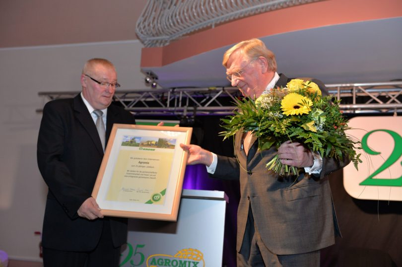 Nie zabrakło oczywiście prezentów i gratulacji dla Józefa Dworakowskiego, autora sukcesu Agromixu. Ze szczególnie ciekawą inicjatywą wyszedł dr Bernard Krone, współwłaściciel niemieckiej fabryki KRONE, który z okazji 25-lecia firmy podarował Józefowi Dworakowskiemu, 25 rocznych stypendiów po 200 euro każde, dla młodych ludzi pragnących studiować agrotechnikę. Studentów ma wskazać osobiście właściciel firmy Agromix. Zebrani na sali goście gromkimi oklaskami podziękowali za ten szczególny podarunek niemieckiego przedsiębiorcy dla młodych Polaków.